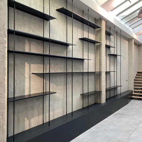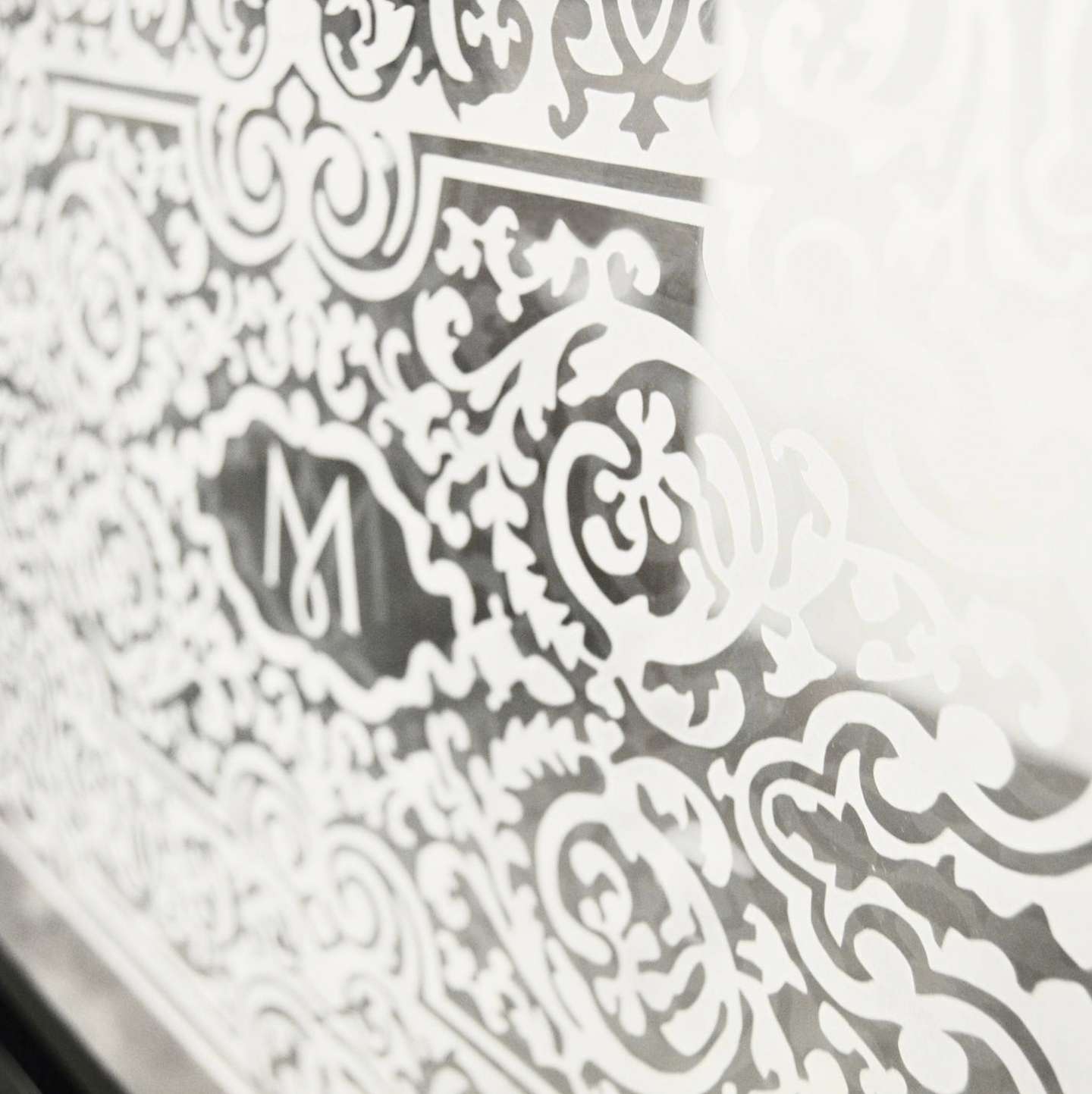Ce cabinet Héritage est une pièce de mobilier qui reprend les codes et les éléments d'un cabinet traditionnel Louis XIV, en ré-interprétant la marqueterie Boulle sur des panneaux de plexiglas, un intérieur de caisson gainé en Alcantara et un extérieur de caisson laqué noir brillant. L'ensemble des caissons est déstructuré par des sections de plexiglas afin d'apporter une certaine légèreté et un dynamisme à un meuble d'ordinaire massif.