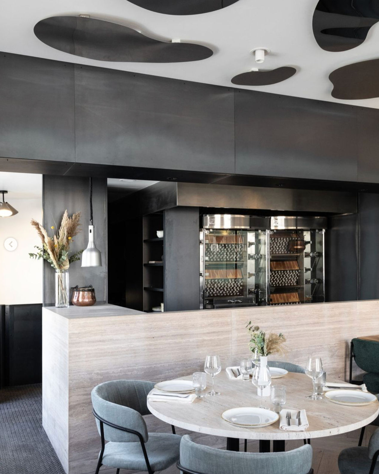 Restaurant Arrageois habillé d'un décor en tôle brute et d'un escalier en acier brut également, complété de tôles polies miroir au plafond.